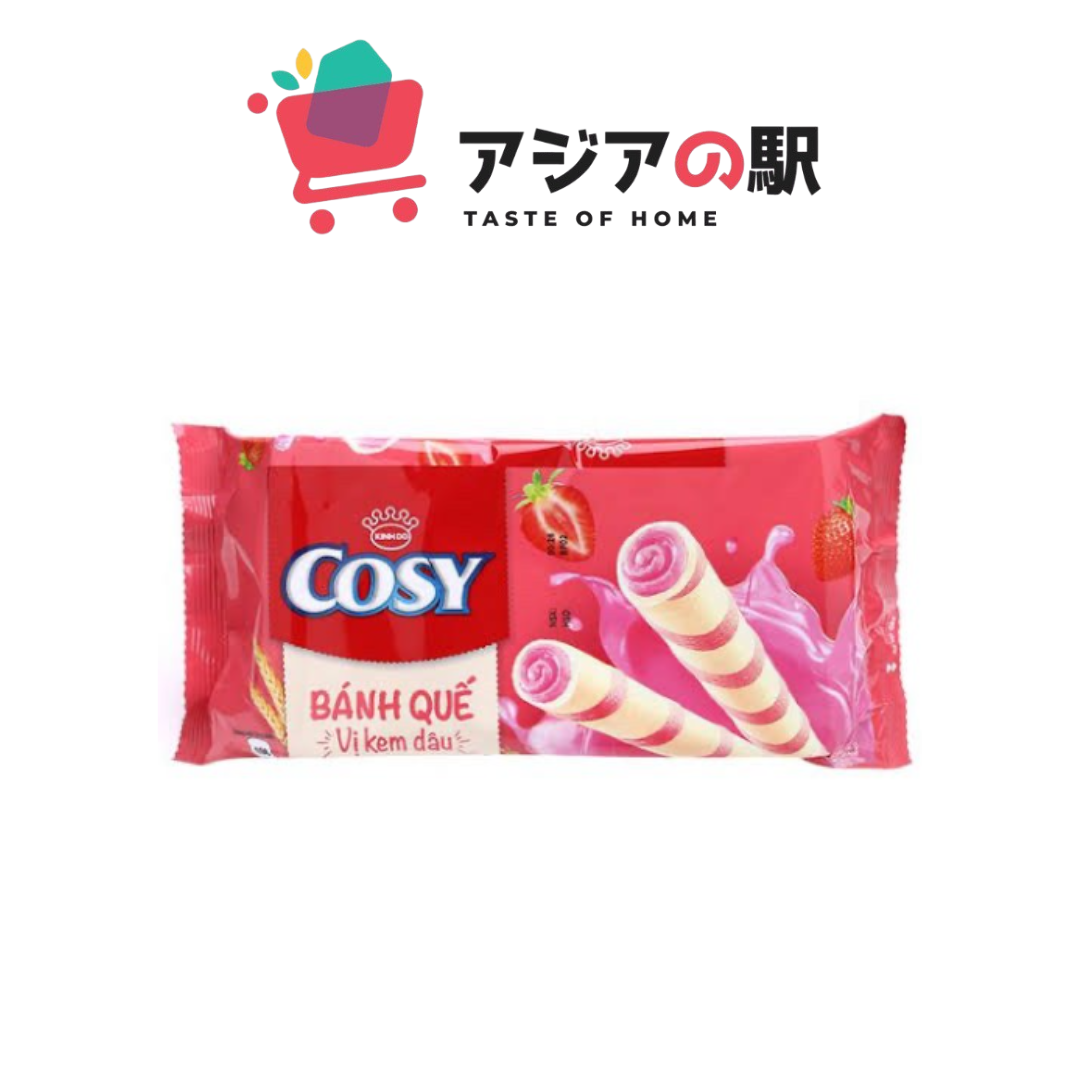 コージーのストロベリーフレーバーのワッフルロールは、サクサクとした食感と甘酸っぱいイチゴクリームが絶妙なバランスのスナックです。ベトナムで人気のスイーツで、お茶やコーヒーのお供にぴったりです。