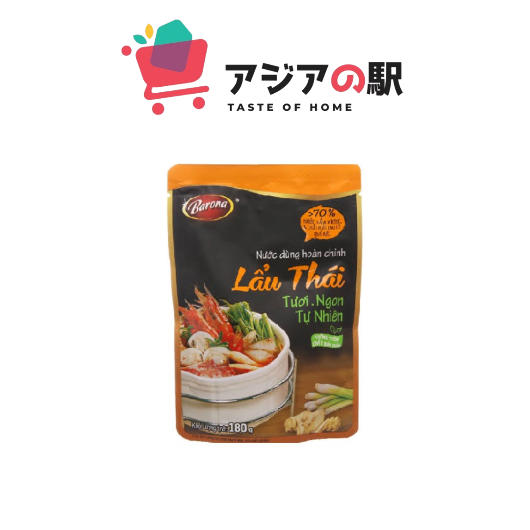 タイ鍋用だし「BARONA」は、ベトナムで製造された本格的なタイ風スープの素です。酸味と辛味のバランスが絶妙で、簡単にタイ鍋の味を再現できます。野菜やシーフード、肉類を加えるだけで、家庭で手軽に楽しめます。